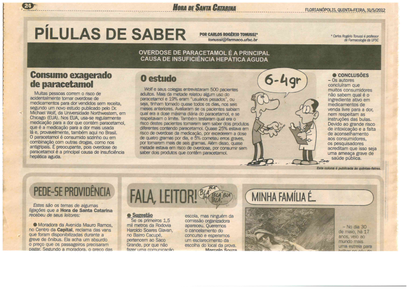 Muitas pessoas correm o risco de acidentalmente tomar overdose de medicamentos para dor vendidos sem receita, segundo um novo estudo publicado pelo Dr. Michael Wolf, da Universidade Northwestern, em Chicago (EUA). Nos EUA, usa-se regularmente medicação para a dor que contém paracetamol, a medicação para a dor mais usada lá e, provavelmente, também aqui no Brasil. O paracetamol é consumido sozinho ou em combinação com outras drogas, como nos antigripais. É preocupante, pois overdose de paracetamol é a principal causa de insuficiência hepática aguda.
